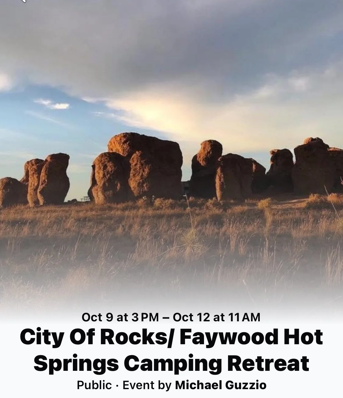 I invite you to experience the energy and beauty of The City Of Rocks and Faywood Hot Springs. These sacred Stones and healing springs are tucked away in a powerful energy vortex that you'll get to visit and experience on this 3 day retreat.